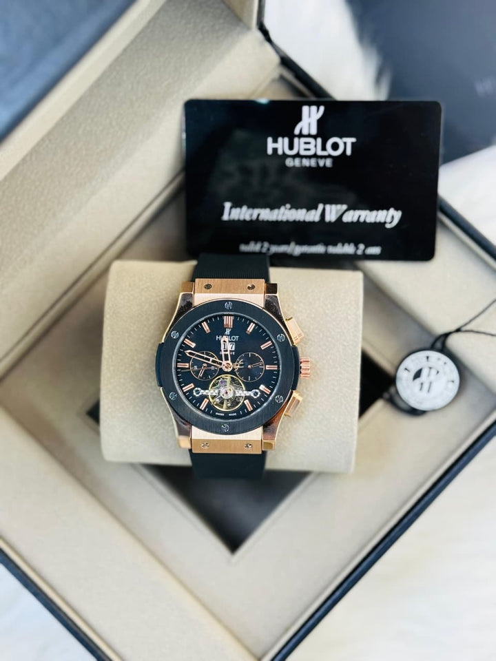Crafted with rose gold accents and a black strap, this timepiece embodies luxury and modern flair