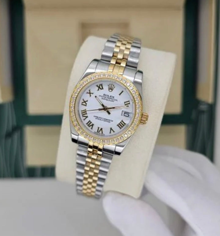 Refined silver dial Rolex with two-tone bracelet and diamond bezel.
