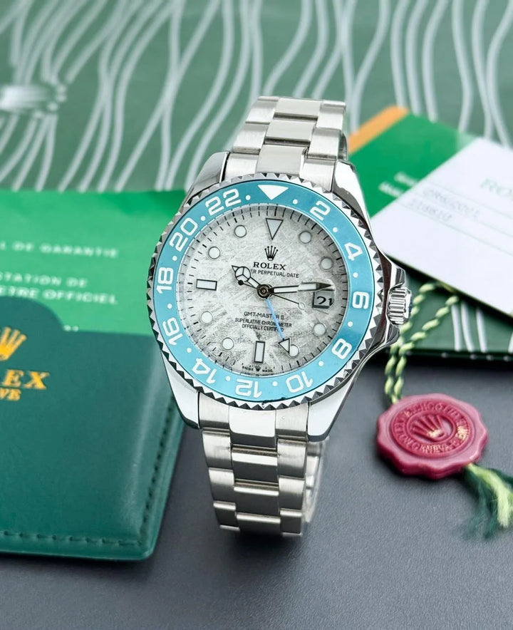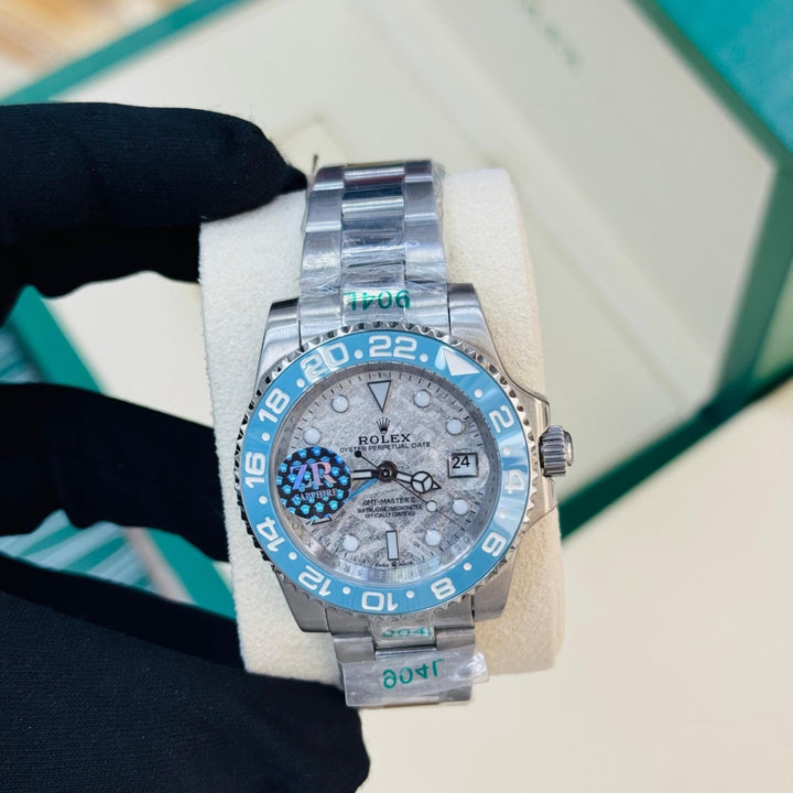 This Rolex GMT-Master II features a rare meteorite dial with a striking blue and grey bezel. A luxury