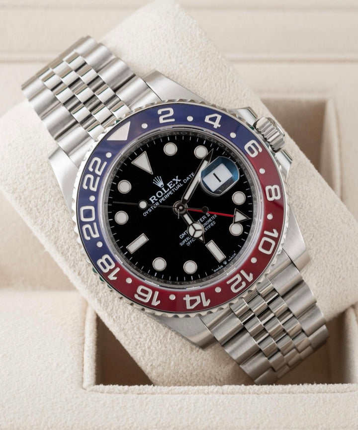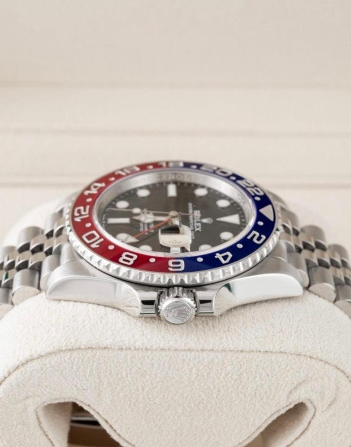 One of Rolex’s most iconic designs, the 'Pepsi' GMT-Master II showcases a red and blue ceramic